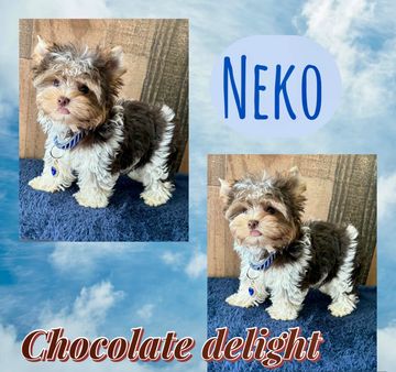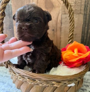 Handsome chocolate tiny tricolored parti male with nice thick coat and beautiful eyes.